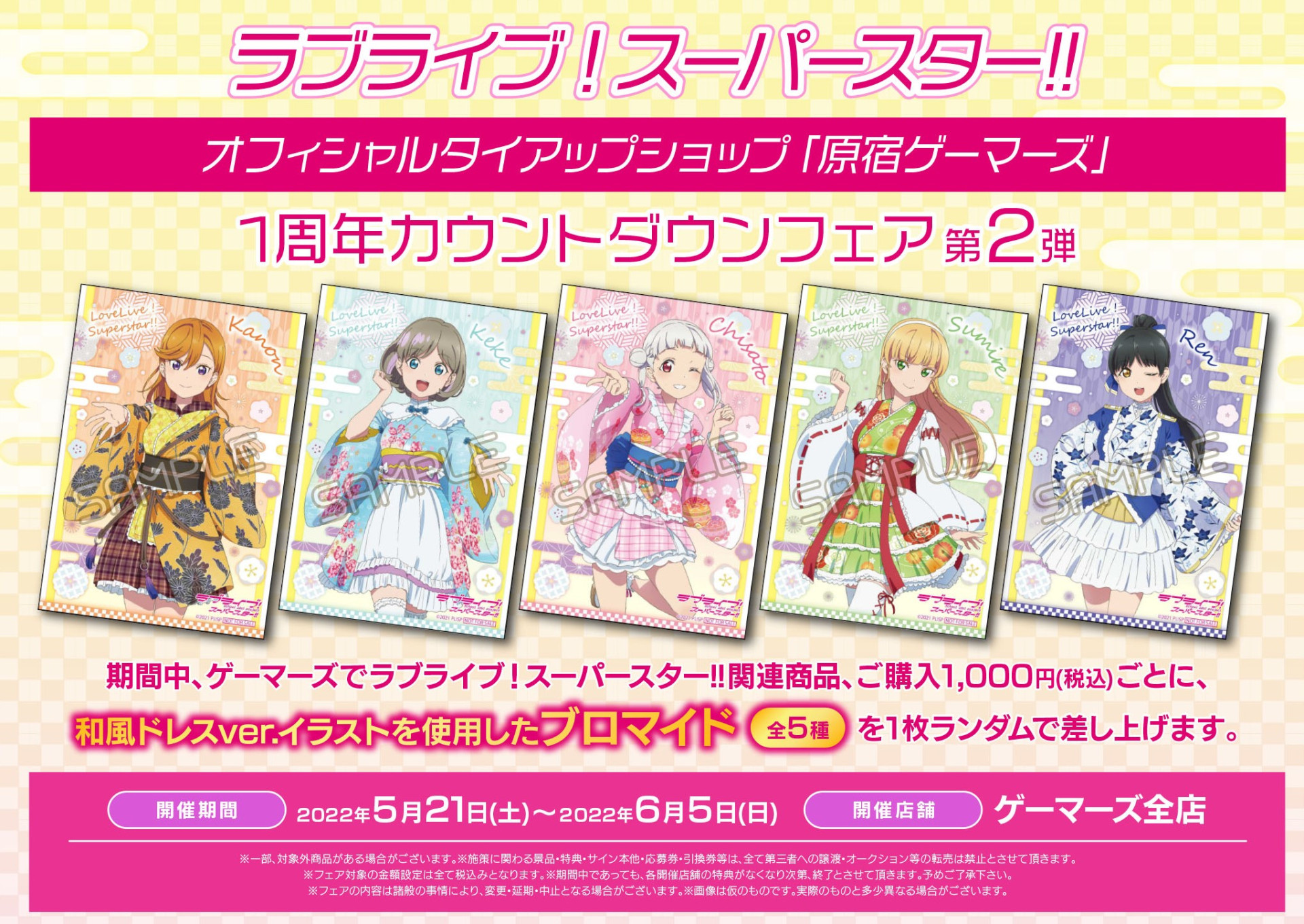 期間中、ゲーマーズでラブライブ!スーパースター!!関連商品ご購入1,000円(税込)ごとに、ラブライブ!スーパースター!!和風ドレスver.イラストを使用したオリジナルブロマイド(全5種)を1枚ランダムで差し上げます。